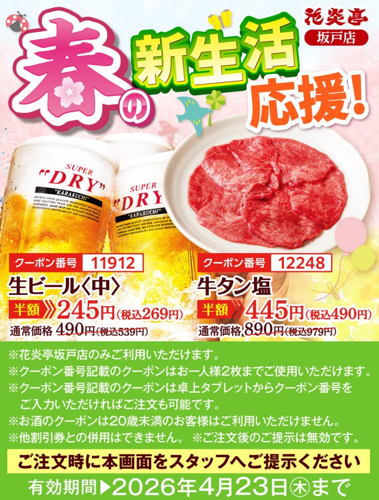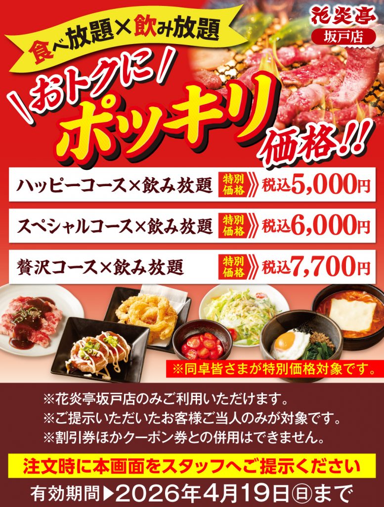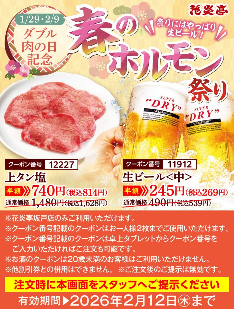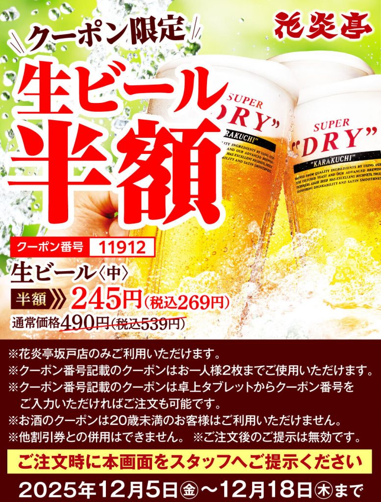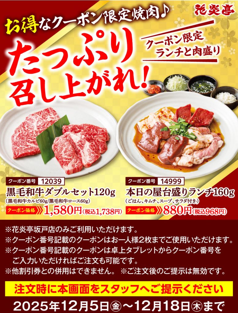 ※下記クーポンは花炎亭坂戸店のみ有効です。